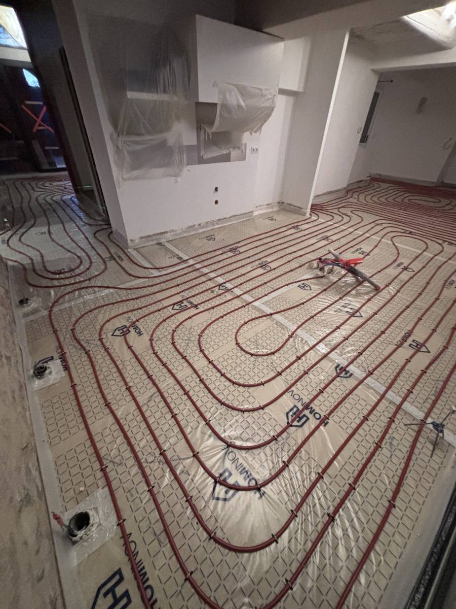 Vient ensuite l’installation du plancher chauffant à eau, un service technique de précision nécessitant un calepinage rigoureux, une fixation maîtrisée et un contrôle permanent des circuits. Ce produit assure un confort optimal et une diffusion homogène de la chaleur.