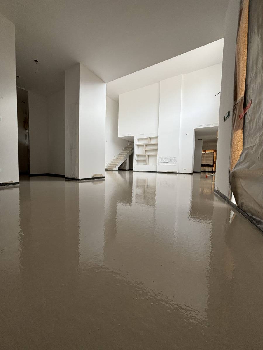Le chantier a consisté à fournir et mettre en œuvre une chape anhydrite fluide d’une épaisseur de 5 cm sur une surface de 279 m². Ce produit, reconnu pour sa fluidité et sa capacité de nivellement, permet une application uniforme et rapide, sans nécessité de talochage manuel.