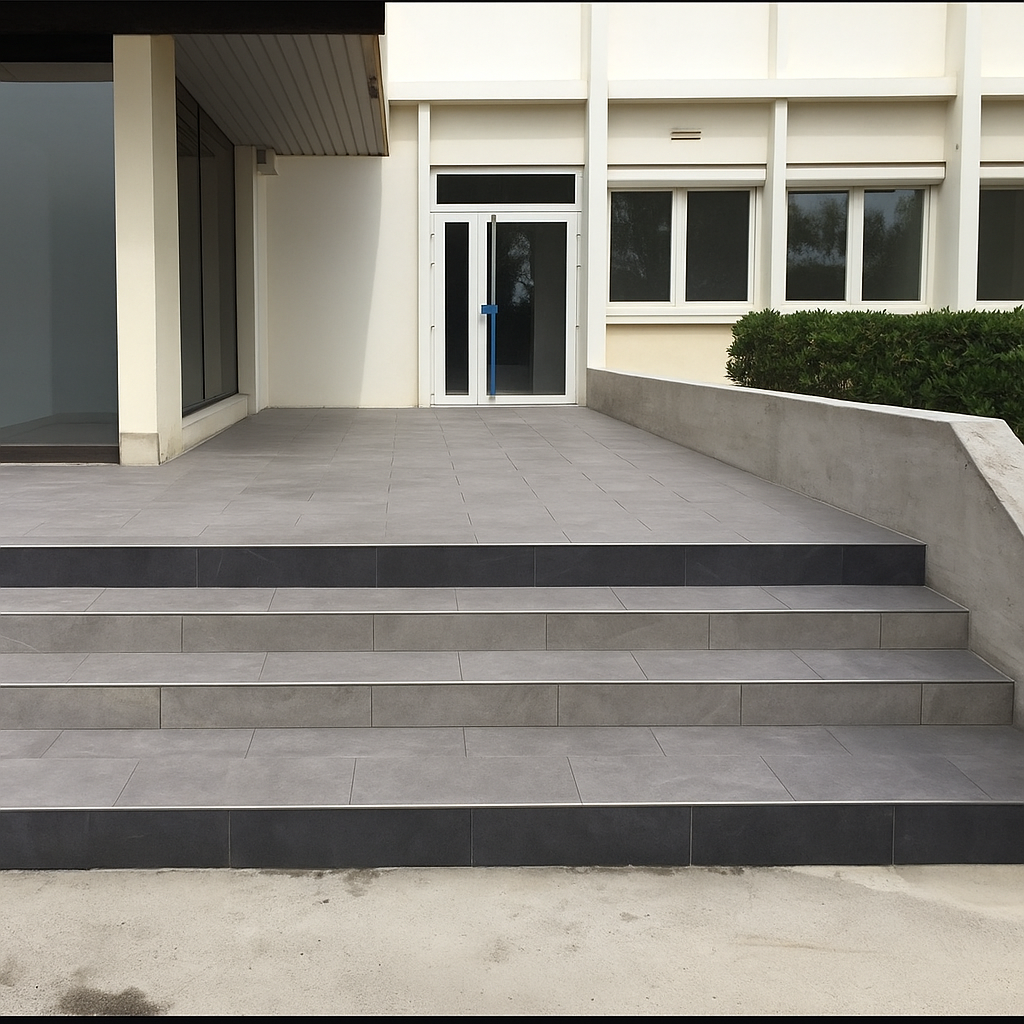 Après le temps de séchage nécessaire, PSEC a procédé à la seconde étape : la pose de carrelage sur l’ensemble de la surface, incluant la chape et les marches, garantissant à la fois esthétique, durabilité et sécurité pour les usagers.