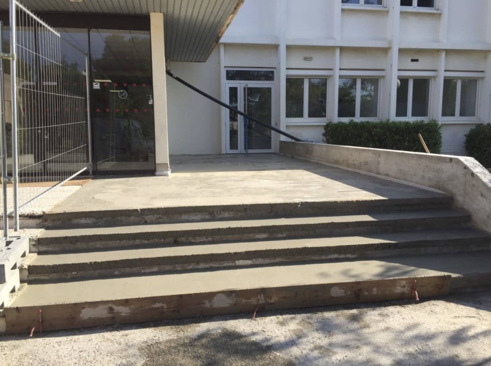 Dans un premier temps, une chape mécanique a été réalisée, intégrant des formes de pente orientées vers les escaliers afin de permettre une évacuation efficace des eaux pluviales. Les marches ont également été façonnées en chape mécanique, avec un système marche/contre-marche, préparées pour accueillir le revêtement final.